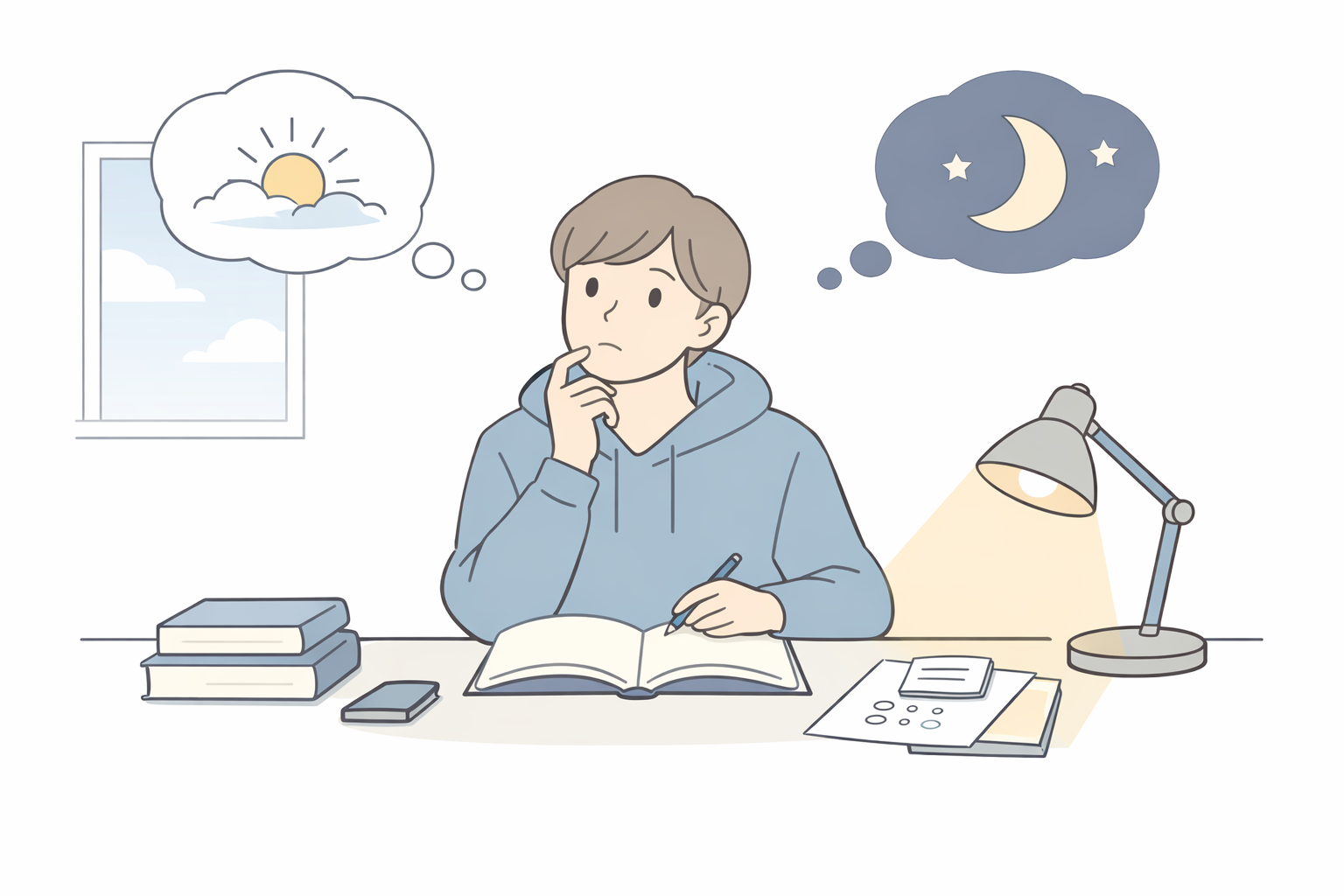 受験勉強をしていると、朝に勉強した方がいいのか、それとも夜の方が自分には合っているのか、迷うことがあると思います。朝早く起きて勉強している人を見ると、その方が正しいように感じるかもしれません。一方で、夜の方が静かで、ようやく頭が働いてくるという人もいるはずです。