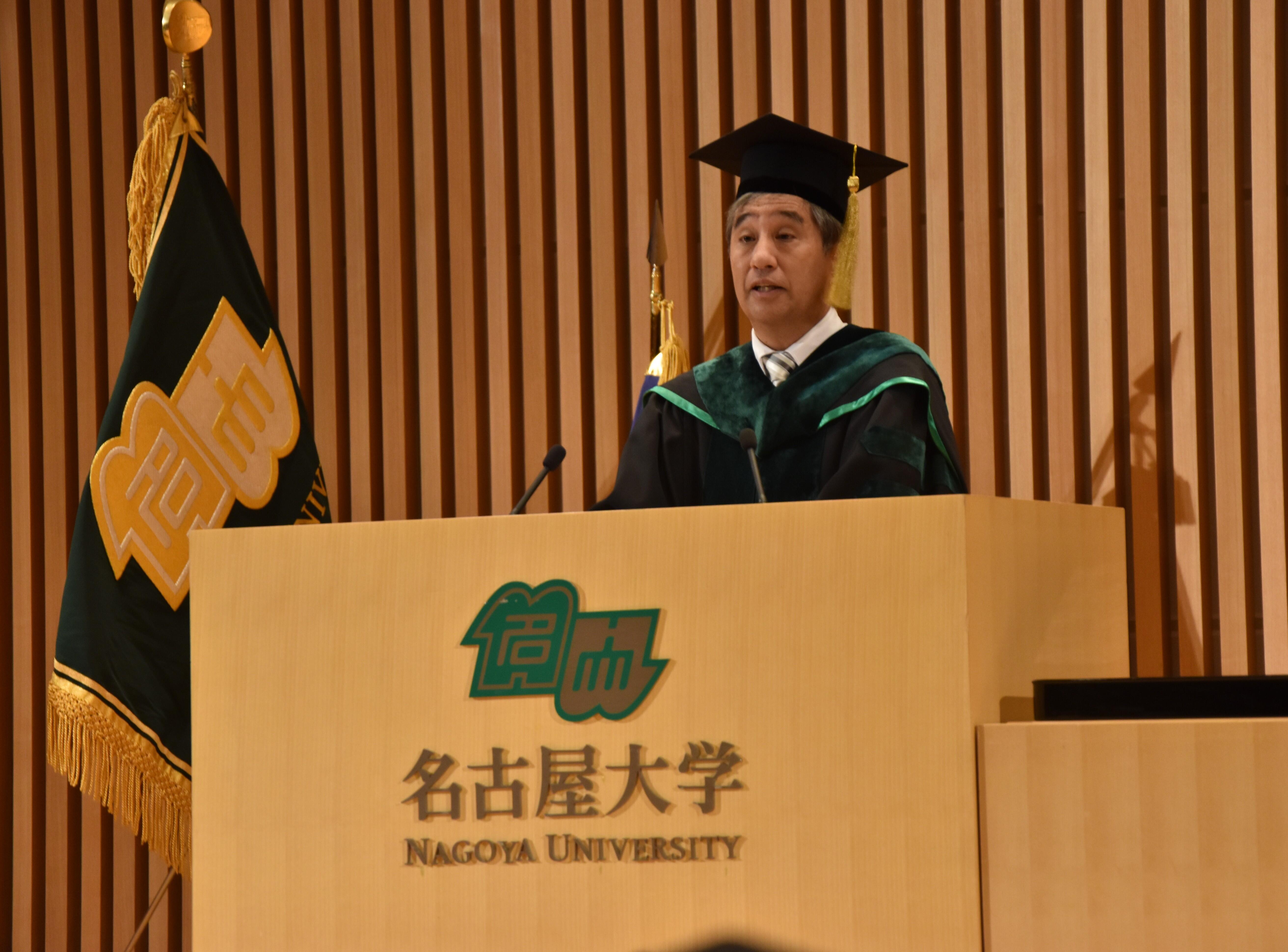 秋季卒業式は、名古屋大学交響楽団による入場曲の演奏の中、総長をはじめとした壇上列席者がアカデミック・ガウンを着用のうえ登壇し、開式しました。卒業生・修了生には留学生が多いことから、式典は英語で進行しました。