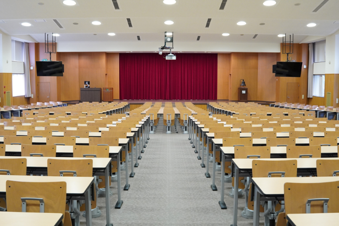 キタンホールは、収容人数約500名を誇る、名古屋大学最大規模の講義室です。今回の改修では、プロジェクター、AV機器を最新のものに更新し、スクリーン及びディスプレイは従来設置のものより一回り大きいものを設置しました。これにより、他の講義室との連携システムを活用することで、コロナ禍下においても質の高い講義を機動的に実施することが可能となりました。