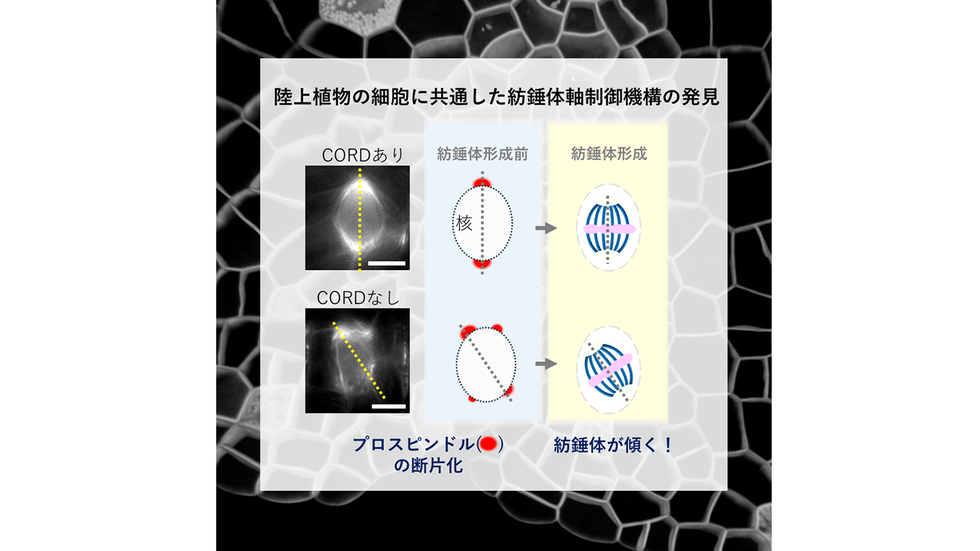 名古屋大学大学院理学研究科の佐々木 武馬 助教、小田 祥久 教授の研究グループは、岡山大学学術研究院環境生命自然科学学域(理)の本瀬 宏康 准教授、神戸大学大学院理学研究科の 石崎 公庸 教授との共同研究により、陸上植物の細胞分裂の新たな制御機構を明らかにしました。研究グループは、基部陸上植物のゼニゴケと被子植物のシロイヌナズナを用いて、細胞分裂時に発現するCORD遺伝子の働きを解析しました。その結果、CORD遺伝子が産生するタンパク質が、細胞分裂に不可欠な紡錘体の向きを安定させることで、細胞が正しい方向に分裂できるよう制御していることを発見しました。さらにCORD遺伝子は植物が藻類から陸上植物へ進化した過程で獲得されたと考えられ、この機構の発見は植物の陸上化の理解につながると期待されます。
