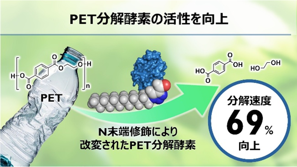 北海道大学大学院地球環境科学研究院の小野田晃教授、北海道立総合研究機構の瀬野修一郎主査、名古屋大学大学院理学研究科、自然科学研究機構 生命創成探究センターの内橋貴之教授らの国際共同研究チームは、酵素を用いたPETリサイクル技術に革新的な改良を加えることに成功しました。研究チームは、ペットボトルや繊維製品に広く使用されるポリエチレンテレフタレート(PET)*1を分解する酵素クチナーゼ*2のN末端*3に疎水性アルキル鎖*4を連結し、分解活性を強化する新技術を開発しました。この改変技術は、遺伝子組換えを必要とせず、簡便な化学反応で酵素を改良できます。疎水性部位を連結した酵素は、PET表面により強く吸着し、本来の触媒活性を保持したまま、PET分解効率が向上します。この改変酵素は天然酵素に比べて、分解物であるテレフタル酸(TPA)*5の生成量を最大69%増加させることが確認されました。さらに、高速原子間力顕微鏡(HS-AFM)*6での観察により、改変酵素が天然酵素よりもPET表面に効率的かつ安定的に吸着する様子がリアルタイムで観察されました。走査型電子顕微鏡(SEM)*7による表面分析では、改変酵素処理後のPETフィルムに顕著に分解した表面形状が確認され、PETとの相互作用の強化によって、PET加水分解を促進できることを明らかにしました。