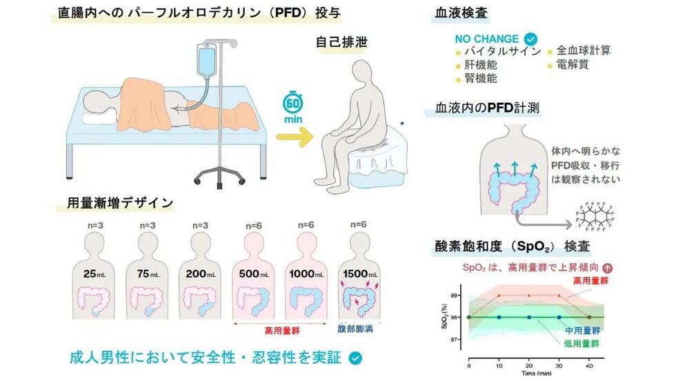 東京科学大学(Science Tokyo)総合研究院 ヒト生物学研究ユニットの武部貴則教授(大阪大学大学院医学系研究科教授/同ヒューマン・メタバース疾患研究拠点 副拠点長)、名古屋大学医学部附属病院 麻酔科の藤井祐病院准教授らの研究チームは、腸換気法(用語1)に用いる液体「パーフルオロデカリン(Perfluorodecalin, PFD)(用語2)」の単回経肛門投与が、ヒトにおいて安全で忍容性が良好であることを、世界で初めて実施された臨床第1相試験(First-in-Human試験)(用語3)により明らかにしました。