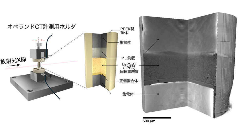 東北大学多元物質科学研究所の木村勇太准教授、大野真之准教授らの研究グループは、大型放射光施設SPring-8(注3)で得られる高輝度X線を用いたコンピュータ断層撮影(CT)によって、SSLSB正極内部の充放電反応の空間分布を、マイクロメートルの高い空間分解能で可視化する手法を確立しました。可視化の結果、正極全体にリチウムイオンを行き渡らせる巨視的なスケールでのイオン輸送の遅さが、SSLSBの高速充放電と安定した充放電サイクルの両方を妨げる大きな要因であることが初めて明らかになりました。本研究で確立した可視化手法は、電池内部で実際に何が起きているかを直接捉えることを可能にするものであり、SSLSBに限らず様々な電池系の電極設計指針を与える重要なツールとなることが期待されます。