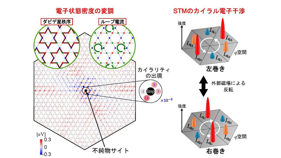 カゴメ格子金属AV3Sb5(A=Cs,Rb,K)では、幾何学的フラストレーション注7)に由来する多彩な新奇量子相や非従来型超伝導が発見されたことから、現在世界中で注目を集めています。有名な実験事実として、走査型トンネル顕微鏡により相次いで観測された、カイラリティ(右巻き・左巻き)を有するナノスケールの電子の波紋「カイラル電子干渉」があります。興味深いことに、そのカイラリティは微小な磁場により反転します。これは時間反転対称性注8)が破れたループ電流相を強く示唆する実験事実であるため、大いに注目を集めましたが、その理論的根拠は未解明でした。