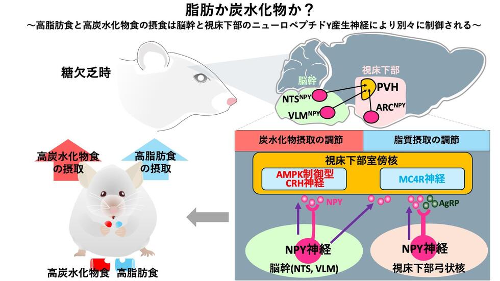 私達は、通常、美味しい食事を好んで食べます。しかし、体内の栄養状態が変化すると、食事の選び方が変わることがあります。例えば、マウスは、高脂肪食が大好きですが、糖が欠乏すると、高脂肪食に加えて、高炭水化物食を選んで食べます。このような食物を選択する脳内のメカニズムはよく分かっていませんでした。今回、箕越靖彦教授、中島健一朗准教授、Rattanajearakul Nawarat (NIPSリサーチフェロー)らの研究チーム(職名はいずれも在職当時)は、マウス用いて、体内で糖が欠乏した時に、高脂肪食と高炭水化物食の摂食を別々に引き起こす神経メカニズムを明らかにしました。本研究は、生理学研究所、名古屋大学、椙山女学園大学において共同で実施されました。研究結果は、Metabolism誌(日本時間2025年10月10日)に掲載されました。