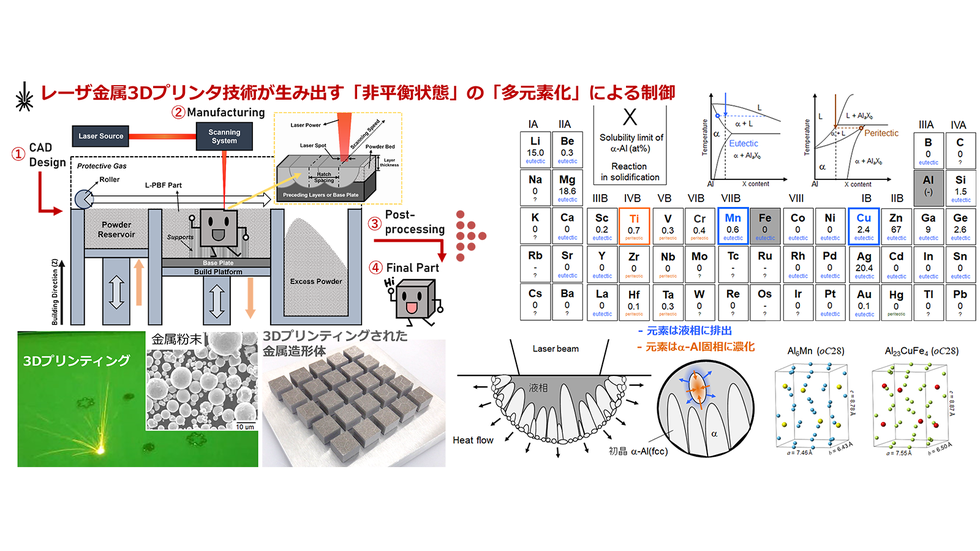 ・提案した考え方に基づいて開発したアルミニウム-鉄(Al-Fe)系合金注3)の造形体は、高強度や高耐熱性などのさまざまな機能を有し、第3・第4元素によって制御できることを明らかにした。