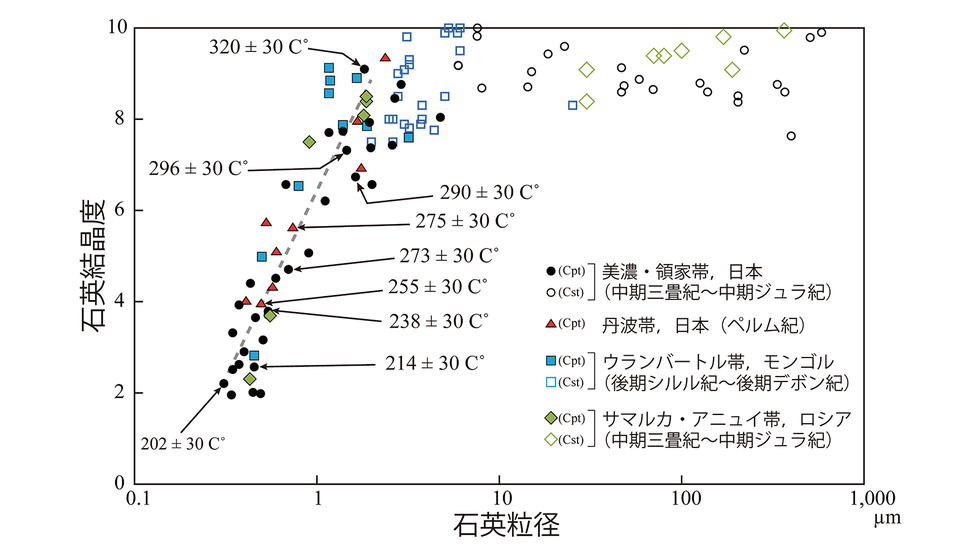 石英の結晶度と粒径は、被熱温度の上昇とともに上昇することが経験的に知られていましたが、その具体的な関係は未解明でした。本研究では、日本、モンゴル、ロシアの生物源チャート注4)試料を分析・比較し、石英の結晶度、粒径、被熱温度の間に以下の関係式が成立することを明らかにしました。