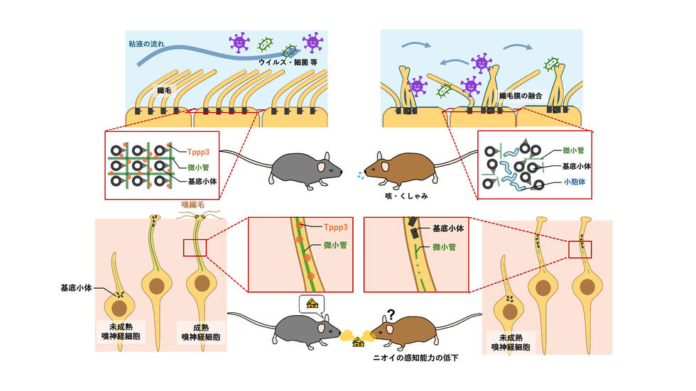 東京農工大学大学院工学府生命工学専攻の酒井敬史大学院生(研究当時:現在は特任助教)と同大学院工学研究院生命機能科学部門の篠原恭介教授、名古屋大学総合保健体育科学センターの石黒洋教授らの国際共同研究グループは、哺乳類のモデル生物マウスにおけるTppp3 (Tubulin Polymerization Promoting Protein Family Member 3) 遺伝子の機能を解析する事によりこれまでに知られていなかった気管上皮と嗅上皮の組織にある繊毛細胞が正確な方向性と繊毛膜構造の独立性を獲得する仕組みを明らかにしました。この仕組みにより繊毛が適切な方向に揃って生えることで、様々な機能を発揮することが可能となっています。この成果により、今後、呼吸器の異常や嗅覚障害が引き起こされる仕組みの解明への展開が期待されます。