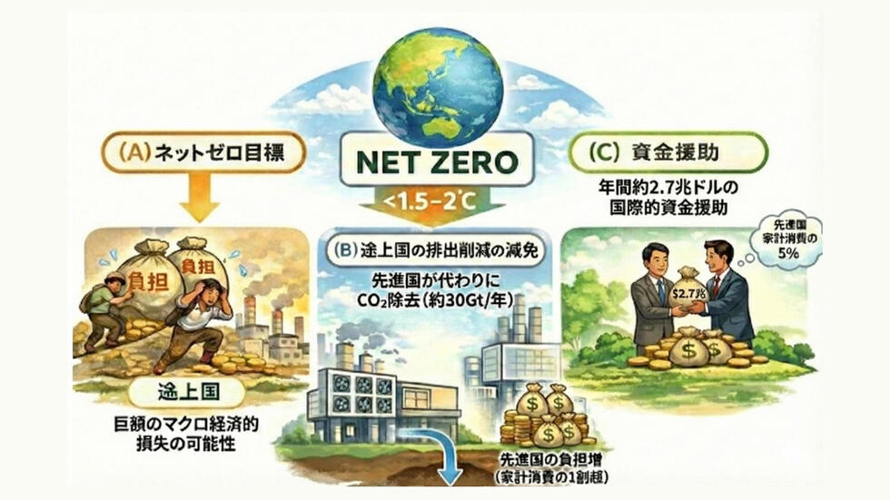 (B) 途上国の排出削減の減免:途上国の排出削減を一部免除し、先進国が代わりに排出削減を担う場合、世界全体で年間約30ギガトン(Gt)のCO2を大気中から回収して貯留する「二酸化炭素除去(CO2除去)」が必要となり、その費用は先進国の家計消費の10%を超える規模に達する