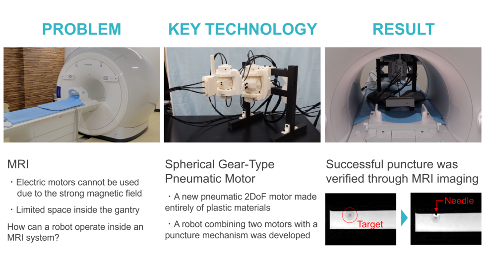 研究グループはこれまで、MRI・CT環境での使用を想定した球状歯車型空圧モータを開発し、基礎的な性能評価を行ってきました。本研究では、このモータを複数組み合わせ、先端に針を刺す機構を備えた穿刺ロボットを新たに開発しました。名古屋大学と東海中央病院による共同研究プロジェクトとして、東海中央病院のMRI室において実証実験を実施し、MRI装置が稼働する強力な磁場環境下においても、ロボットを遠隔操作し、標的に対して穿刺が可能であることを確認しました。