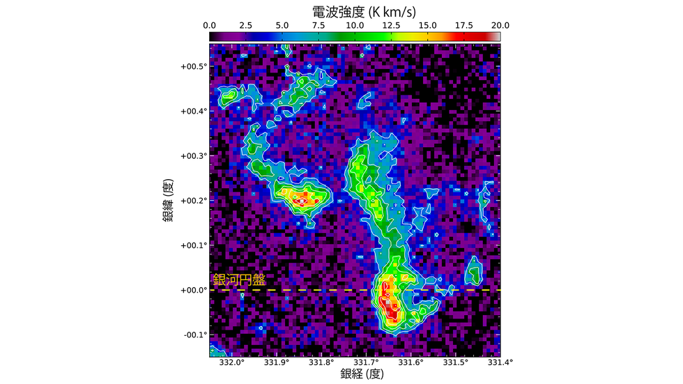 ・天の川のじょうぎ座注1)の方向に銀河円盤から垂直に尻尾のように伸びた構造(ヘッドテイル構造)を持つ分子雲を発見した。