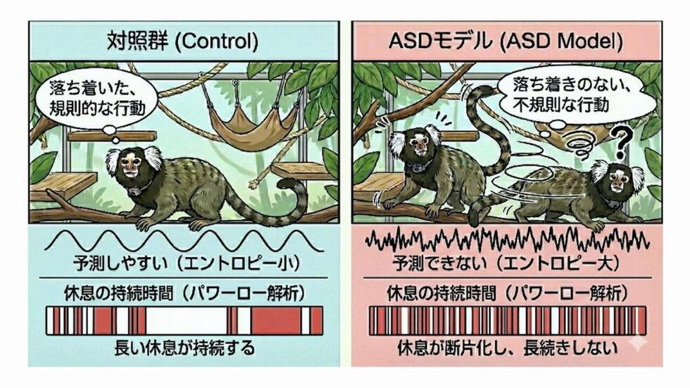 国立精神・神経医療研究センター(NCNP)神経研究所微細構造研究部 一戸紀孝部長、中村月香リサーチフェロー、名古屋大学大学院情報学研究科 川合伸幸教授、大阪大学大学院基礎工学研究科 中村亨教授らの研究グループは、自閉スペクトラム症において落ち着きのなさ(多動性)を単なる「動いた量」だけで評価するのではなく、動きの不規則性や時間構造として定量化することを目指し、自閉スペクトラム症(ASD)の特性を示すモデル動物(コモンマーモセット)で解析を行いました。その結果、休息が途切れやすく多動に加えて「動き方が不規則で予測しにくい」という特徴が認められ、さらにこうした不規則な活動パターンが、ストレスに関わるホルモンであるコルチゾール値と関連する可能性も示されました。本研究により、活動の総量だけでは捉えにくかった多動性の側面を「いつ・どの場面で・どのように動いているか」という時間構造として客観的に評価できる可能性が示されました。これは、「多動がある/ない」という単純な二分を超え、個人差や状況依存性を前提とした理解につながるものです。将来的には、スマートウォッチ等の日常的デバイスによる計測と組み合わせることで、多動性を定量的に評価する指標の開発や、年齢や状況に応じた個別支援・介入効果の評価に貢献することが期待されます。