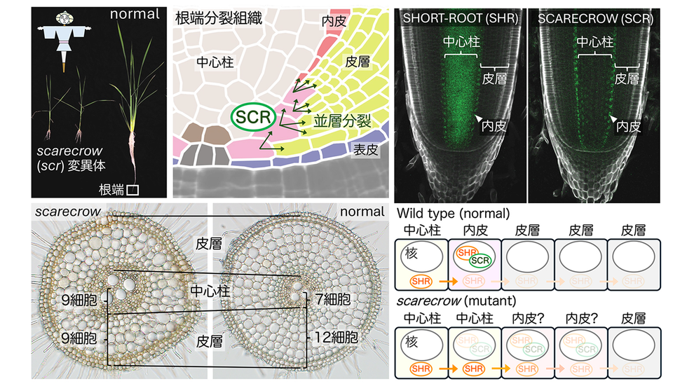 GRASファミリー転写因子は、植物に特有の転写因子のファミリーであり、植物ホルモンのシグナル伝達や根の組織構造の形成を始めとする発生に深く関わる。SCARECROW(SCR)とSHORT-ROOT(SHR)は根の内皮-皮層始原細胞において内皮と皮層を生み出す並層分裂を制御する機能をもつ。