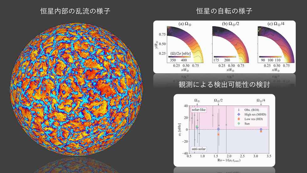 太陽は緯度ごとに異なる周期をもつ自転、差動回転をしています。100億年にわたる太陽進化のある時点で赤道が速く極が遅い「太陽型」から「反太陽型」への差動回転分布の遷移があることが、これまでの数値シミュレーション研究により予想されていました。その一方で、観測的にはこの理論予想と整合しない結果もあり、課題となっていました。