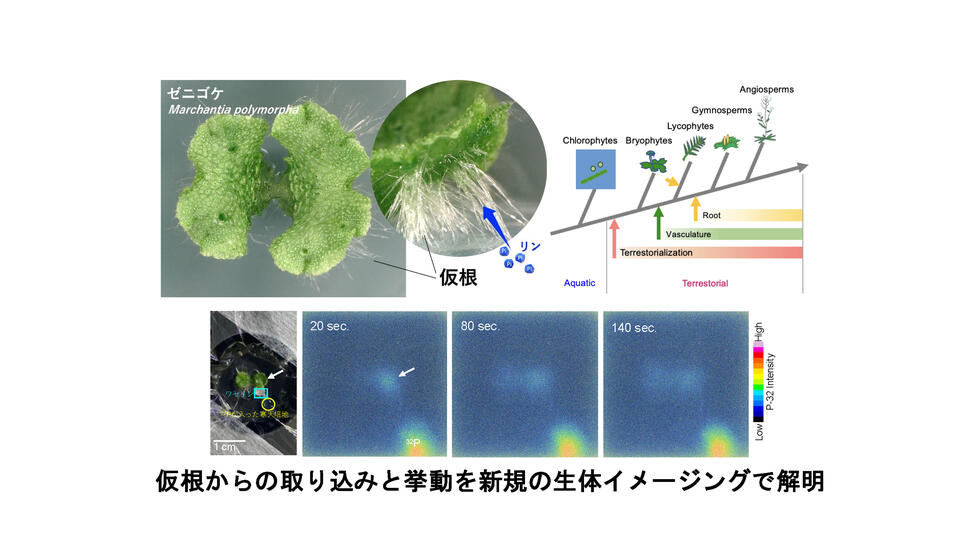 ・維管束(根と水や栄養を運ぶ組織)を持たないコケ植物ゼニゴケにおいて、独自開発した生体イメージング技術により、仮根から吸収されたリンが植物体内部へ短時間で移動する様子をリアルタイムで可視化することに成功した。