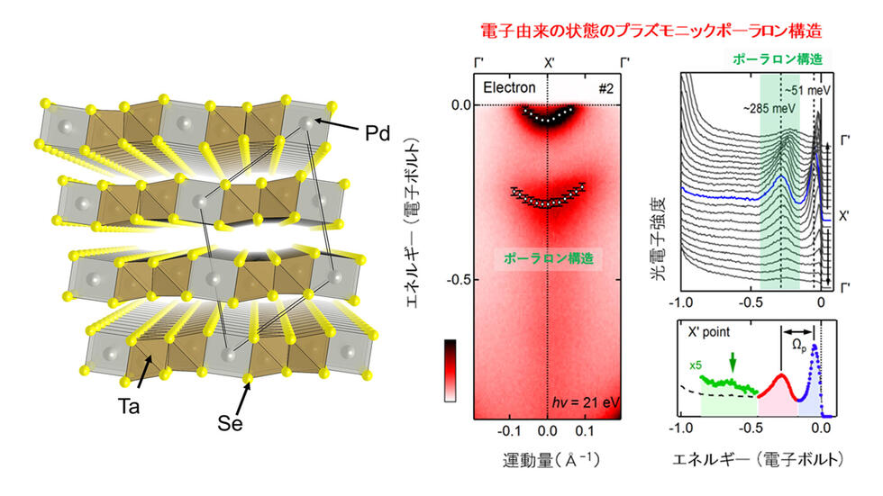 岡山大学学術研究院先鋭研究領域(異分野基礎科学研究所)の大槻太毅准教授と名古屋大学大学院理学研究科の中埜彰俊助教(現:同大学大学院工学研究科講師)、寺崎一郎教授、京都大学大学院人間・環境学研究科の吉田鉄平教授、広島大学大学院先進理工系科学研究科の長谷川巧准教授、広島大学放射光科学研究所の有田将司技術専門職員、高エネルギー加速器研究機構(KEK)物質構造科学研究所の堀場弘司准教授(現:量子科学技術研究開発機構上席研究員)、北村未歩助教(現:量子科学技術研究開発機構主任研究員)らの研究グループは、半金属でありながら極めて高い熱電性能を示す準一次元物質Ta₂PdSe₆において、電子と集団的電荷振動が結合した新しい準粒子状態「プラズモニックポーラロン」を世界で初めて直接観測しました。