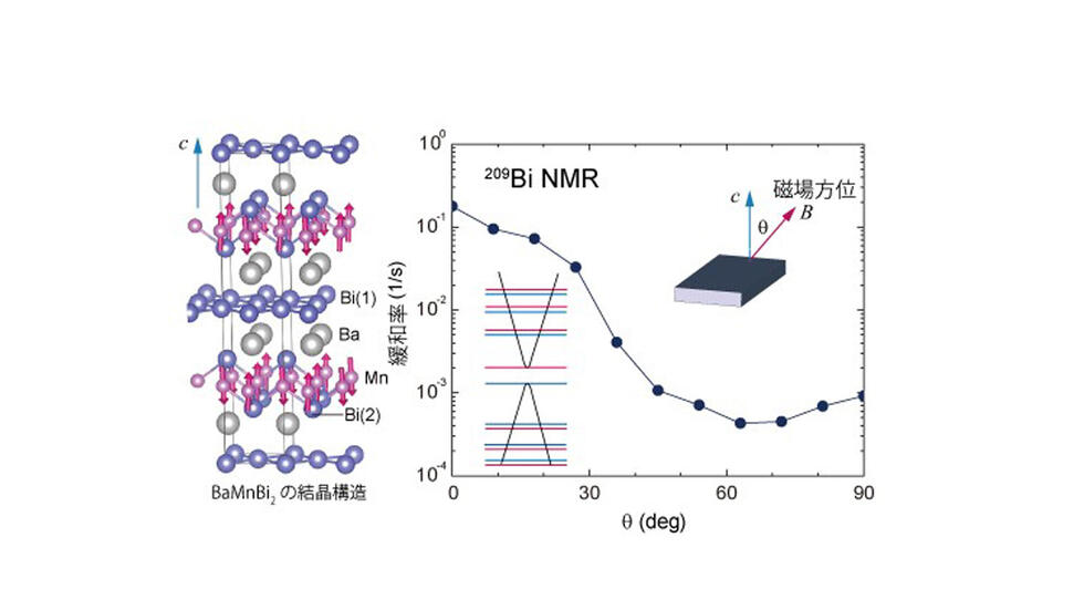 本研究は、核磁気共鳴法(NMR)を用いて、量子ホール状態のバルク磁気励起を初めて明らかにしました。グラフェンなどの電子の有効質量がゼロに近いディラック半金属では、弱い磁場で電子の軌道運動のランダウ量子化が起きますが、相対論的な効果であるスピン軌道相互作用(SOC)の影響は未解明でした。同研究グループは、SOCの大きなビスマス化合物において、NMRで電子スピンの低エネルギー励起を調べた結果、極低温下の量子化によってスピン励起が100倍以上増大することを見つけました。この結果は、SOCの弱いグラフェンの模型とは異なり、スピン分極の根拠を与えるものです。