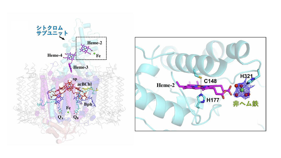 本研究では、クライオ電子顕微鏡を用い、1.8 Åという極めて高い分解能でLH1–RC複合体を解析し、未知の膜タンパク質protein-3hを同定しました。さらに、この膜タンパク質の近傍には、ヘム(鉄を中心に持つ環状分子)に結合していない孤立した鉄が存在することを明らかにし、この鉄が電子伝達の中継点として機能する可能性を示しました。これらの知見は、光合成の理解を深めるとともに、遺伝子改変によるバイオテクノロジー応用や、硫化水素を含む排水処理など環境インフラ維持への貢献につながると期待されます。