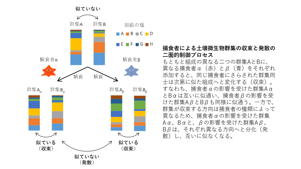 ・捕食者は優占細菌を選択的に捕食し、多様な細菌が共存しやすい群集を形成。さらに、種ごとに異なる方向へ群集を誘導することを解明。