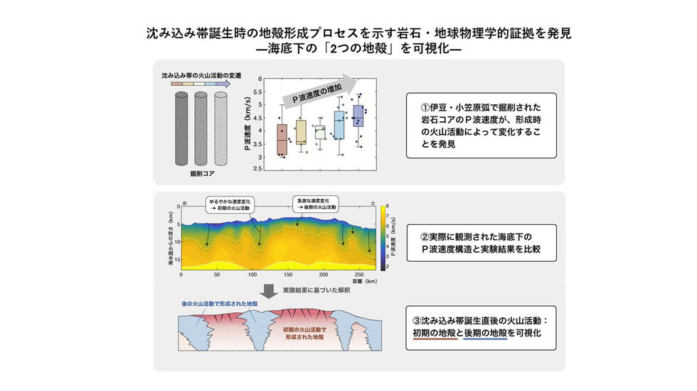 沈み込み帯の誕生は、地球のプレートテクトニクスの始まりに関わる重要な転換点です。大陸や日本列島の成り立ちを理解するためには、沈み込み帯誕生直後に地殻がどのように形成・進化したのかを解明する必要があります。しかし、そのような地殻形成をもたらした火山活動がどのように起こったのかを示す直接的な証拠は乏しく、長年未解明でした。本研究では、国際深海科学掘削計画(International Ocean Discovery Program: IODP)※4第352次研究航海(伊豆・小笠原弧前弧域調査掘削)で採取された岩石コア試料を用い、密度や空隙率※5、P波速度などの岩石物性を詳細に測定しました。その結果、沈み込み帯誕生後直後の火山活動で形成された岩石と、その後の火山活動で形成された岩石とでは、内部の割れ目(クラック)の量の違いが原因でP波速度が大きく異なることを明らかにしました。この結果を、掘削地点周辺で観測されている地震波速度構造と組み合わせることで、地殻が沈み込み開始直後の海底拡大を伴う火山活動と、海底拡大終了後に起こった火山活動の2つの段階を経て作られたことを、実際の地下構造として裏付けました。これは、大陸形成と関連する前弧地殻がどのように作られるのかを地球物理学的に初めて示す成果です。
