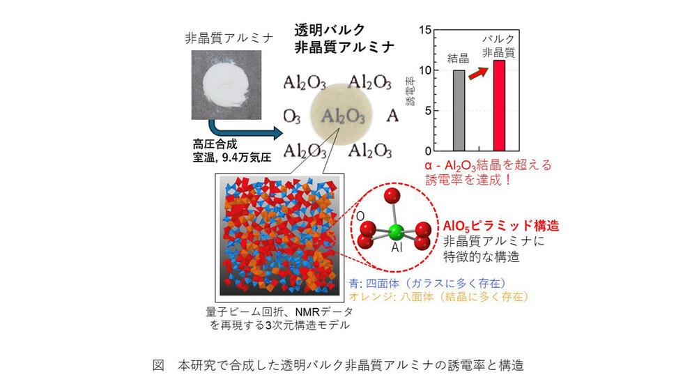 1. 工学院大学(学長:今村 保忠、所在地:東京都新宿区/八王子市)と物質・材料研究機構(理事長:宝野 和博、所在地:茨城県つくば市、以下「NIMS」)を中心とする研究チームは、名古屋大学 高田 尚記 教授、京都大学、日本電子株式会社、東北大学、島根大学、岡本硝子株式会社をはじめ、国内複数機関との共同研究により、従来「ガラスにならない」と考えられてきた単一成分酸化物である酸化アルミニウム(Al2O3、アルミナ)について、室温の高圧プロセスにより、ミリメートルサイズの透明な非晶質(アモルファス)の塊(バルク)を合成することに成功しました。得られた試料が、高い熱伝導率や硬さを示すことに加え、誘電率が約11.3と、代表的な結晶相であるα‐Al2O3(サファイア)の誘電率(約10)を上回ることを示しました。