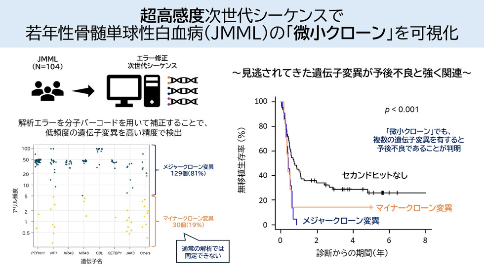 名古屋大学大学院医学系研究科小児科学の髙橋 義行 教授、村松 秀城 准教授、佐治木 大知 助教らの研究グループは、エラー修正次世代シーケンス*1と呼ばれる超高感度の遺伝子解析技術を用いて、若年性骨髄単球性白血病(juvenile myelomonocytic leukemia:JMML)の遺伝子異常を詳細に解析し、複数の遺伝子変異を持つ白血病細胞がわずかでもあると、病気の進行や治療成績と密接に関連していることを明らかにしました。